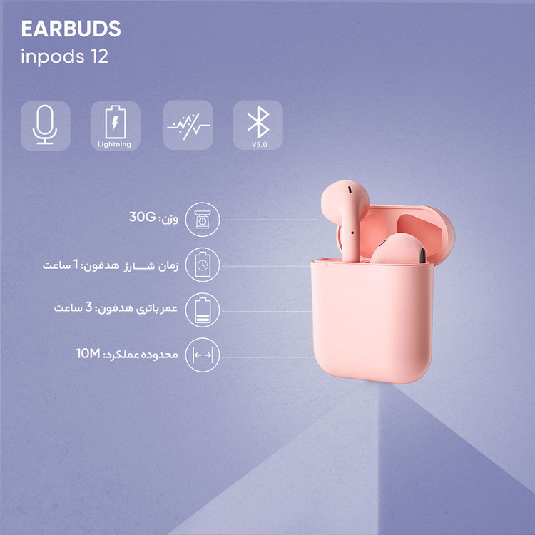 اگر از آن دسته افرادی هستید که ظاهر هدفونهای بلوتوثی برای شما اهمیت زیادی دارد، توصیه میکنیم حتما هدفون بلوتوثی مدل inPods 12 را در لیست خرید خود قرار دهید. این هدفون اقتصادی، طراحی زیبا و کاملاً مشابه با ایرپاد 2 دارد. حتی برای شارژ شدن هدفون بلوتوثی هم از کابل لایتنینگ استفاده میشود. علاوه بر زیبایی ظاهری هدفون، باید به وزن سبک این محصول هم اشاره کرد که باعث میشود بتوانید ساعتها بدون احساس خستگی یا سردرد از هدفون استفاده کنید. هدفون بلوتوثی مدل inPods 12 با وجود قیمت پایین، کیفیت صدای قابل قبولی دارد و با بلند کردن صدا، تغییری در کیفیت موسیقی پخش شده احساس نخواهید کرد. ظرفیت باتری هدفون برابر با 90 میلیآمپر ساعت است و تا 5 ساعت شارژدهی دارد. همچنین اتصال هدفون به گوشی موبایل از طریق بلوتوث ورژن 5.0 انجام میشود که بردی بیشتر از 10 متر دارد و در طول زمان اتصال هم شاهد هیچگونه اختلال یا وقفهای نخواهید بود.